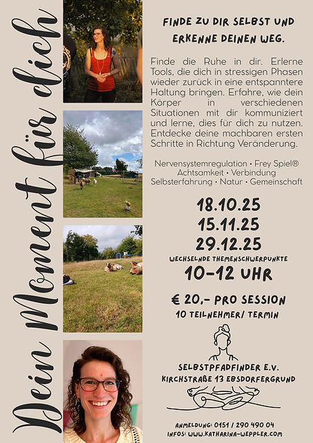 In dem Kurs "Dein Moment für dich" liegt der Schwerpunkt darauf, wieder in Kontakt mit dir selbst zu finden. Durch verschiedene Körperübungen lernen wir, wie wir Einfluss auf unser Nervensystem nehmen können und dadurch die Möglichkeit bekommen, wieder innere Ruhe und Frieden zu empfinden.